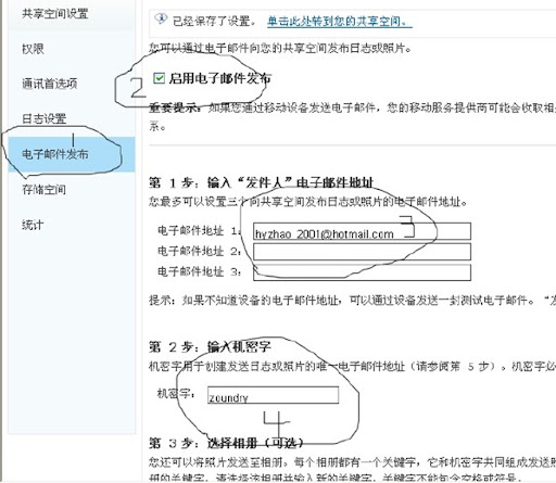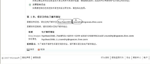 4、帐户密码:(密码来自在msn space设定"电子邮件发布"中的"机密字")