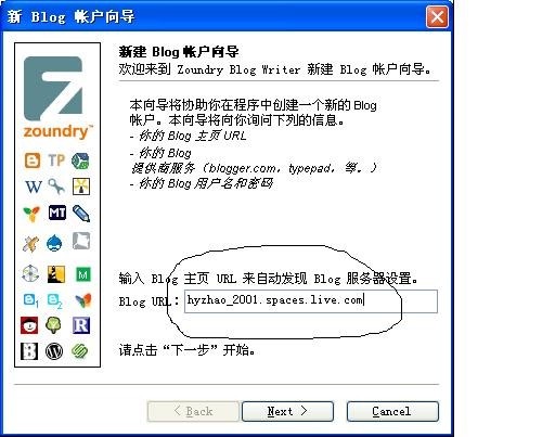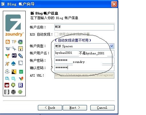 不一定是你的msn帐号,而是你的blog url前的名称,如:我的就是hyzhao2001,与msn帐号是不同的;二是帐户密码,就是你图2所示的"输入机密字",也不是你的msn帐号的密码,除非你要设置成一样。